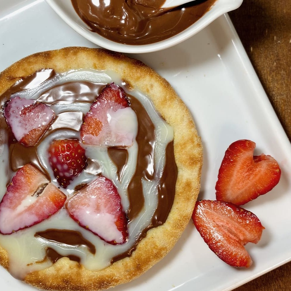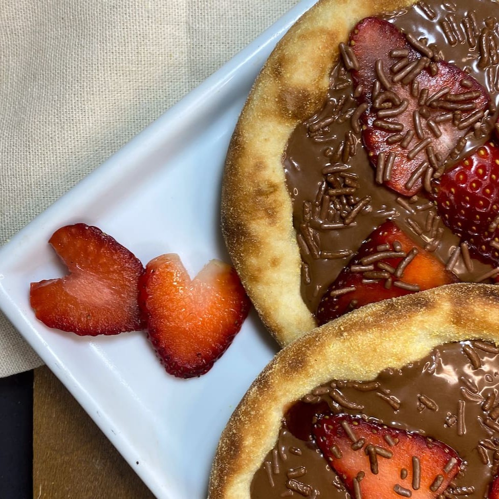 A Clássica Esfiha com massa Artesanal, Chocolate ao Leite, morangos frescos fatiados, finalizada com Leite condensado.