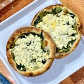 A Clássica Esfiha com massa Artesanal, com Escarola temperada no azeite e alho e Queijo branco com salsinha