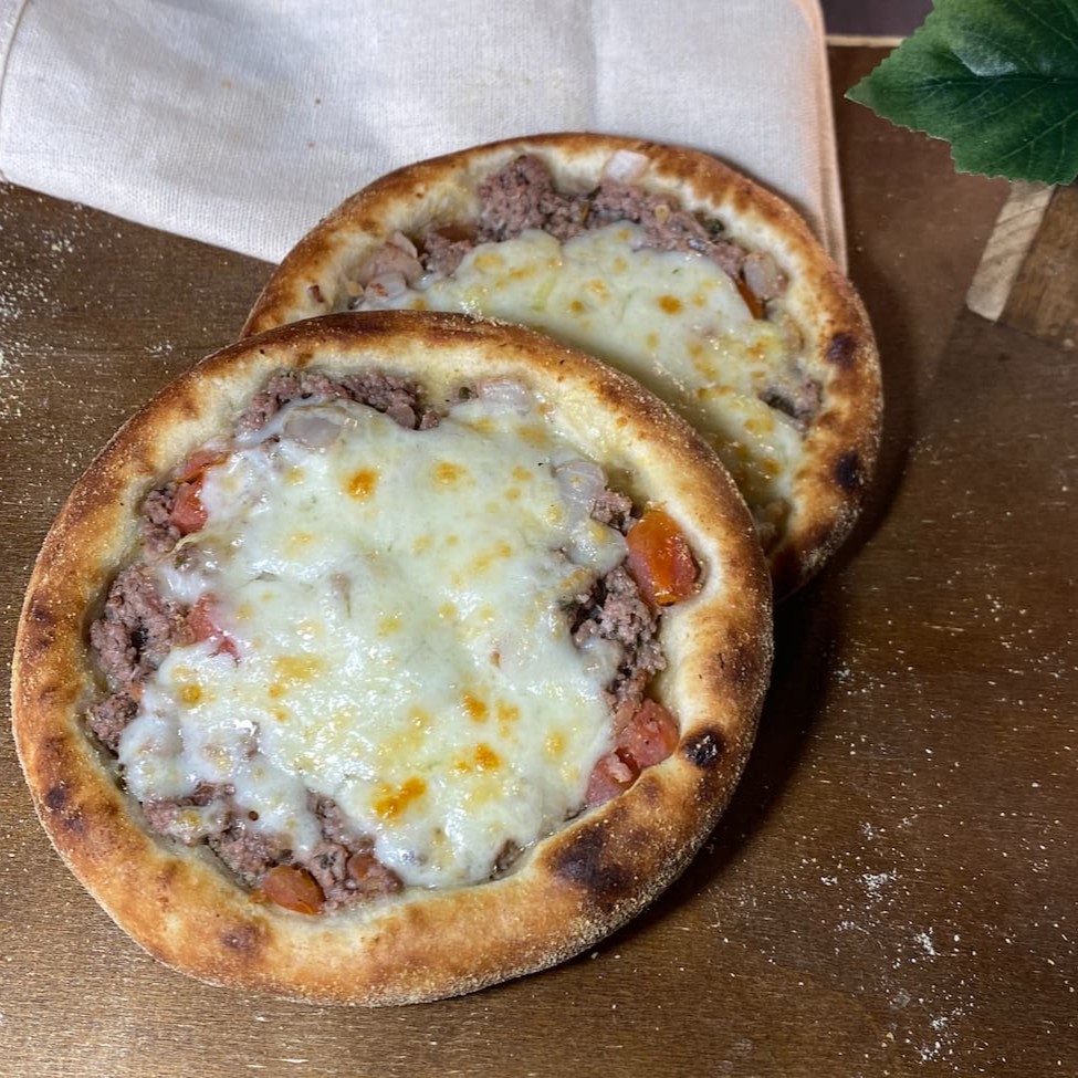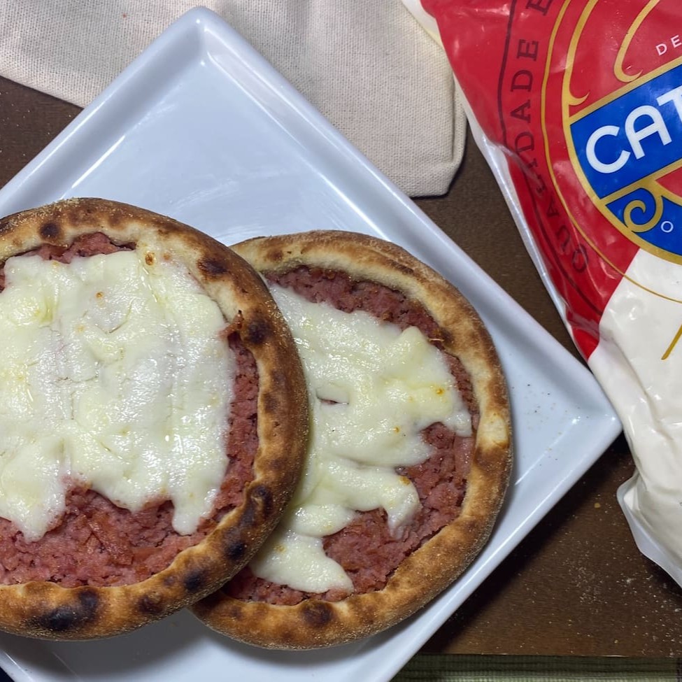 A Clássica Esfiha com massa Artesanal, carne temperada com iguarias Brasileiras, coberta de Queijo Mussarela.