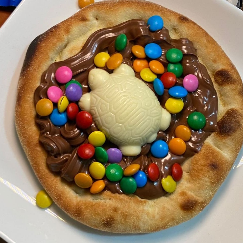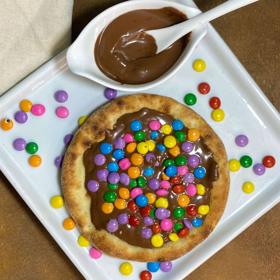 A Clássica Esfiha com massa Artesanal, Chocolate ao Leite, finalizada com confetes.