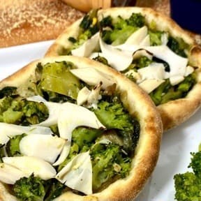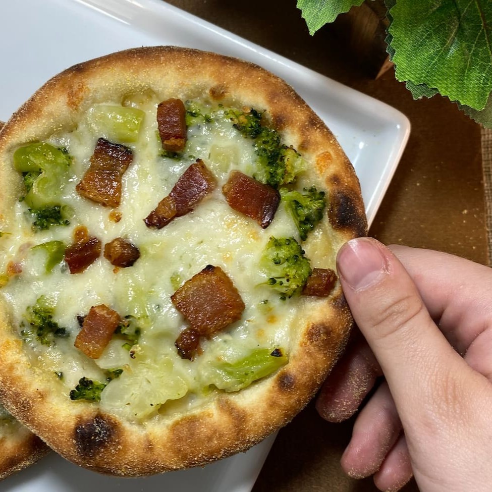 A Clássica Esfiha com massa Artesanal, Brócolis salteados, coberto com Queijo Mussarela, finalizado com pedaços de Bacon dourado na manteiga.