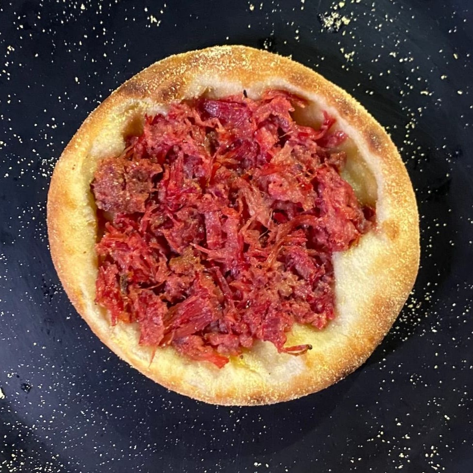 A Clássica Esfiha com massa Artesanal, Carne seca desfiada, finalizada com Mussarela.