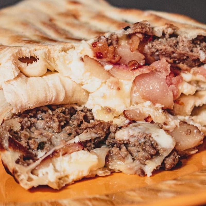 Fogazza recheada com carne moída temperada, queijo muçarela, requeijão, bacon e rodelas de tomate.