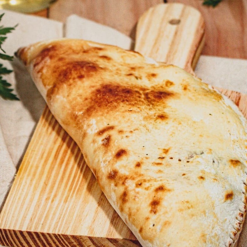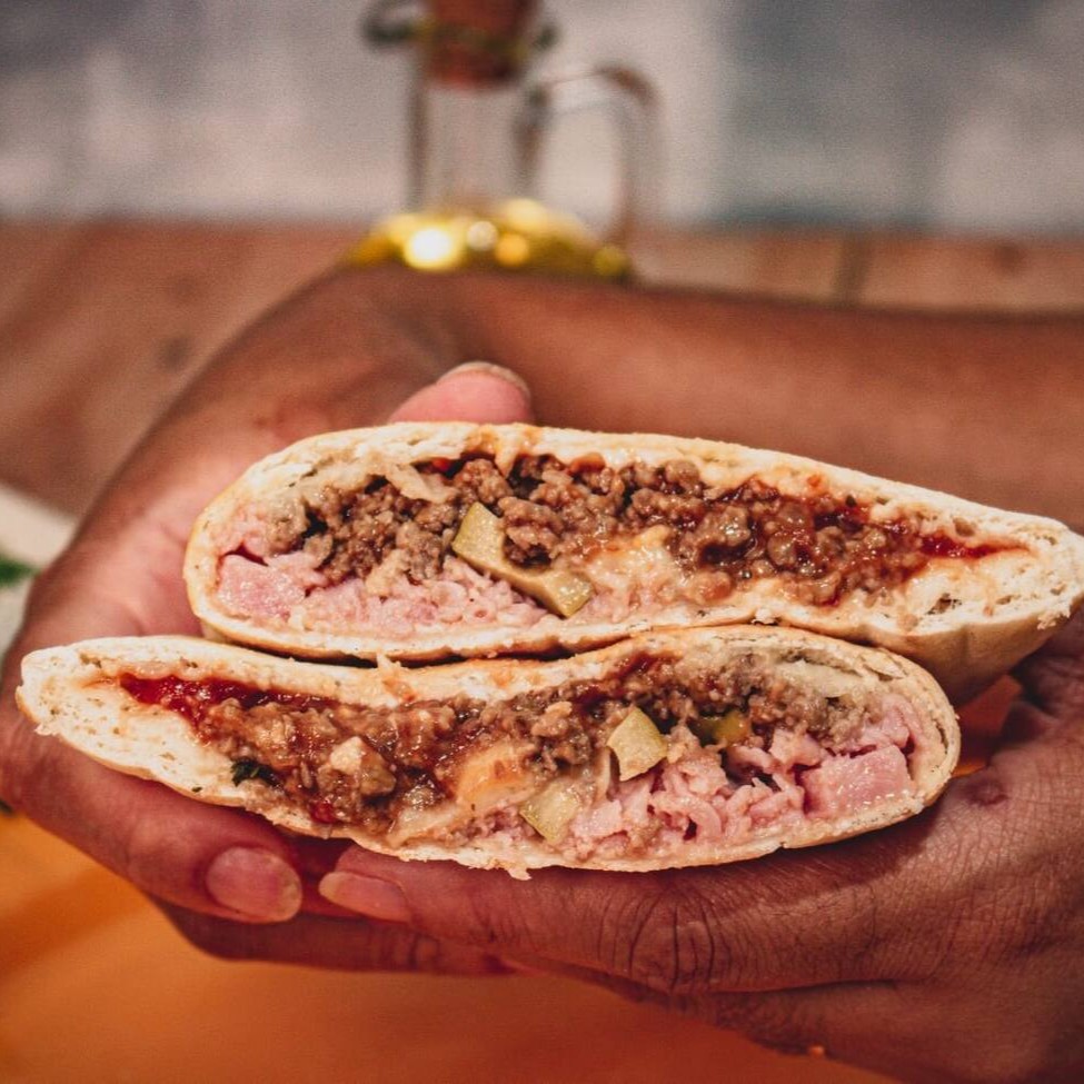 Fogazza assada recheada com carne moída ao molho sugo, presunto ralado, queijo muçarela e azeitonas.