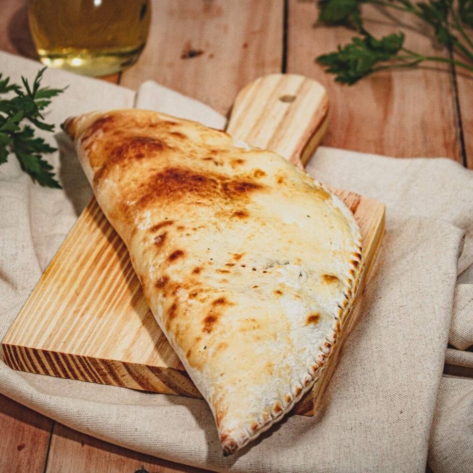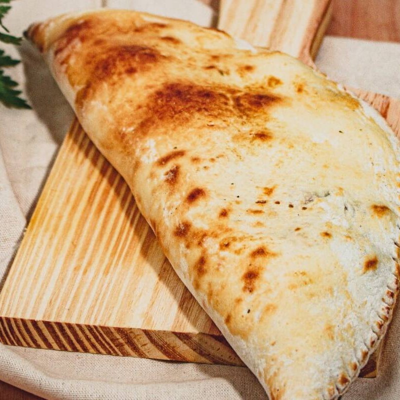 Fogazza recheada com calabresa ralada, escarola, requeijão, bacon e alho frito.