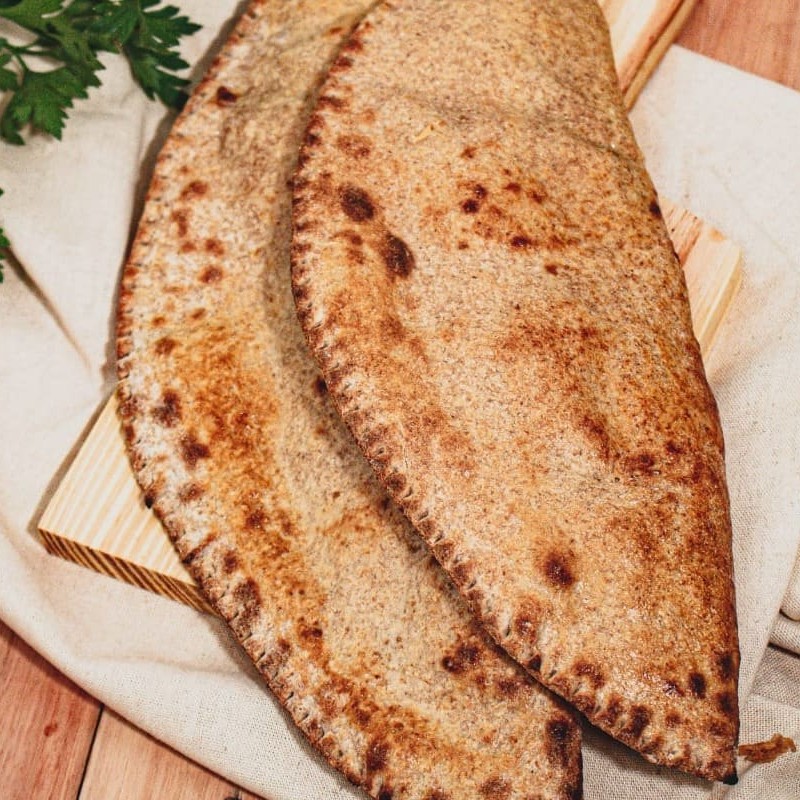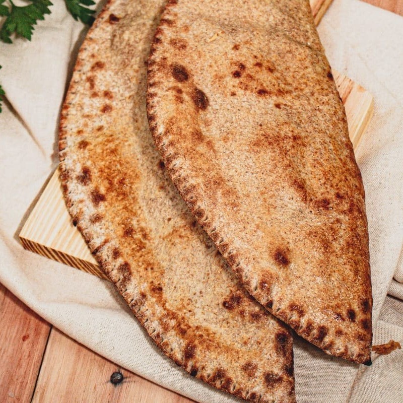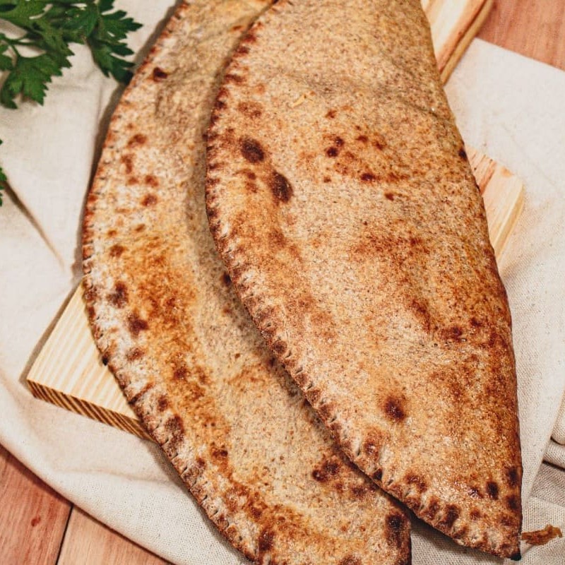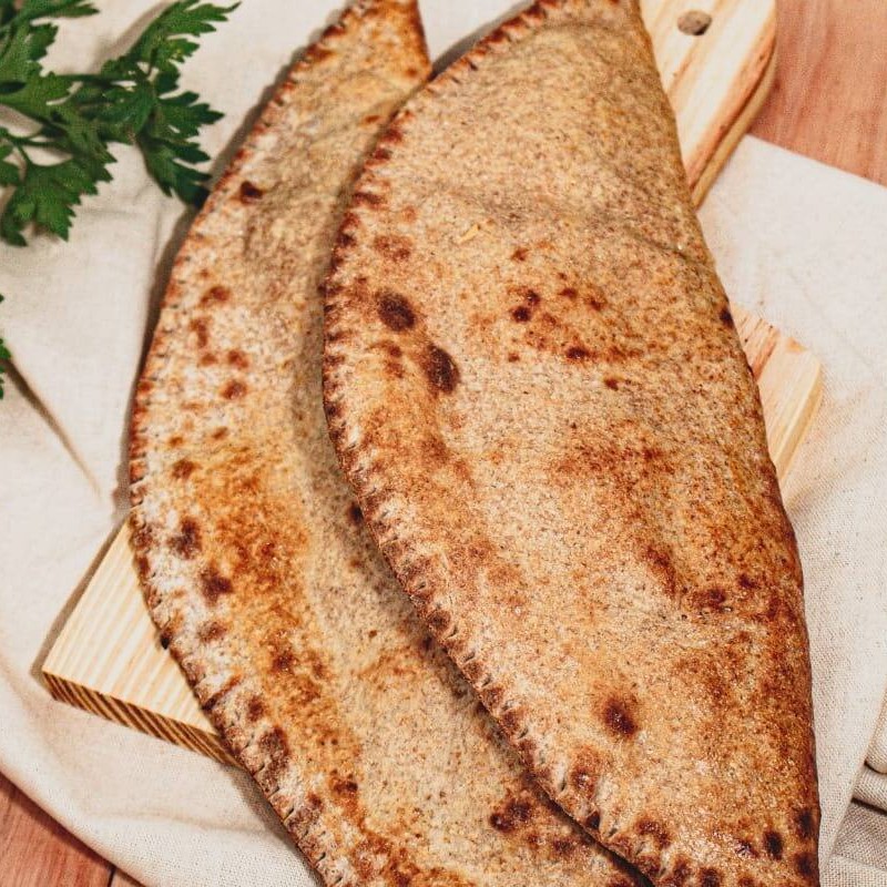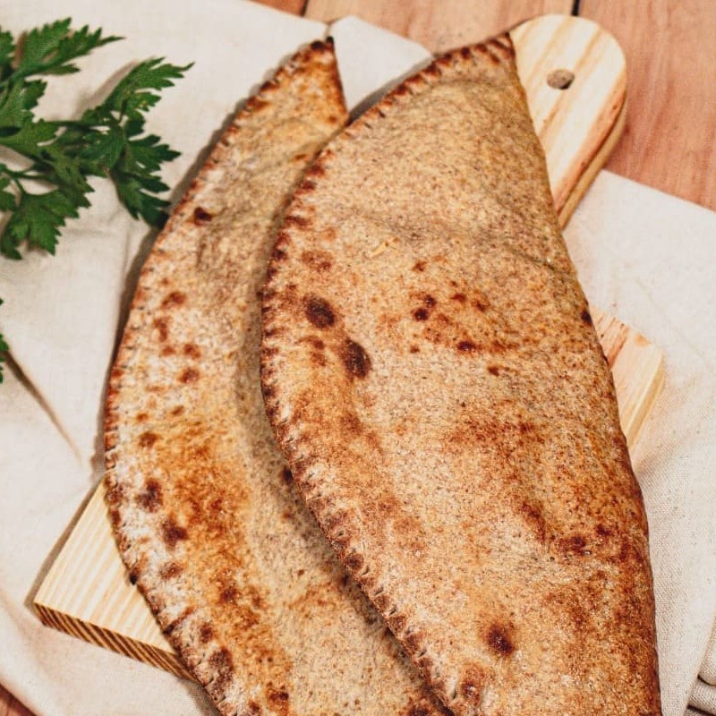 Fogazza assada preparada na massa integral, recheada com brócolis, palmito temperado, cream cheese e milho.