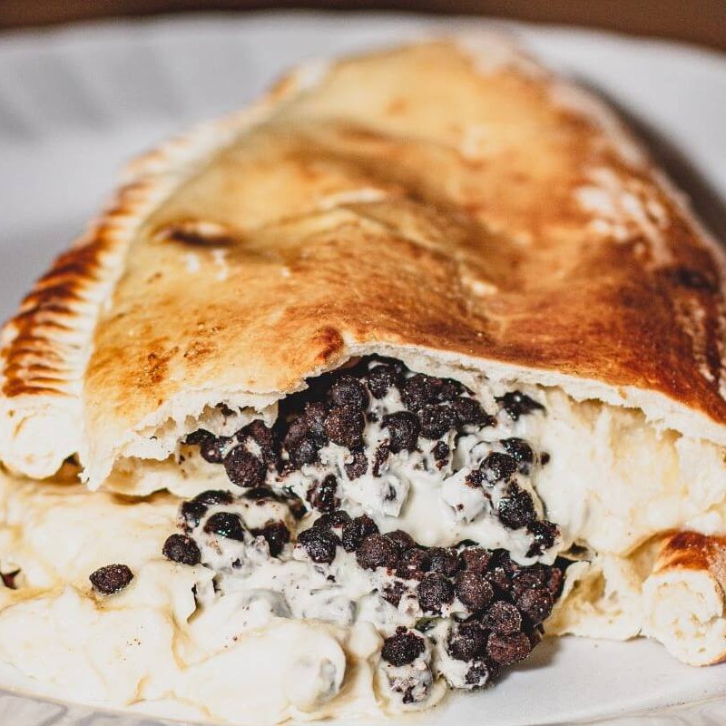 Fogazza assada recheada com chocolate branco, chocolate ao leite e pedaços de biscoito óreo.
