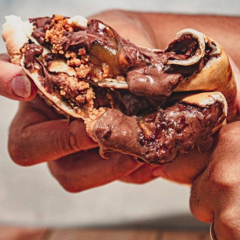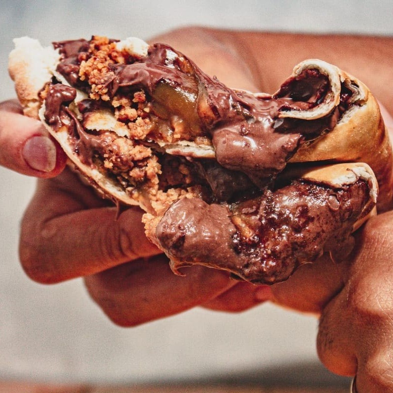 Fogazza assada recheada com chocolate ao leite e granulado.