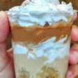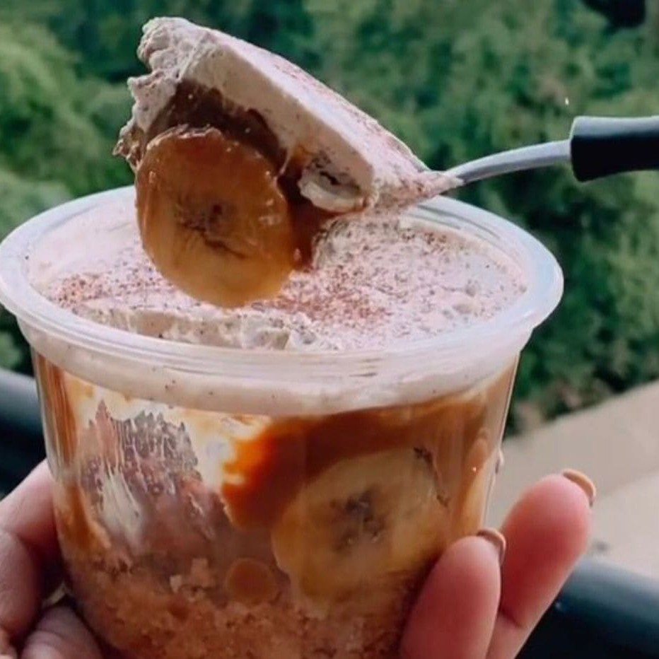 O sabor conjunto do doce de leite e banana com biscoito triturado com acabamento de chantilly e canela.