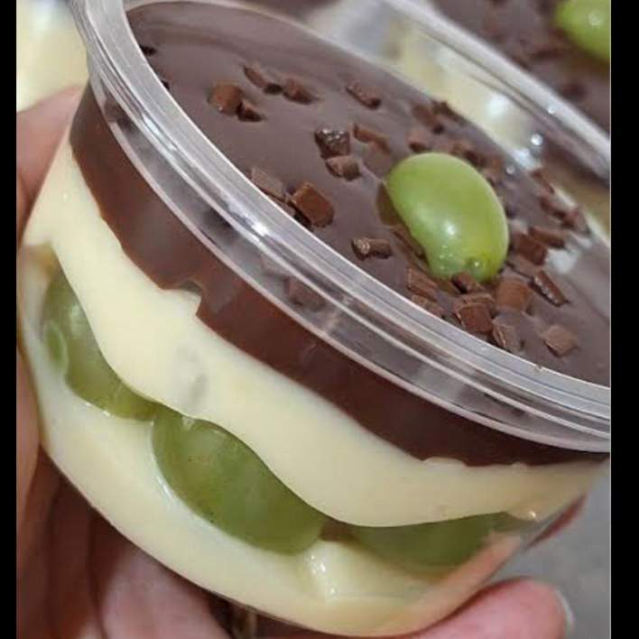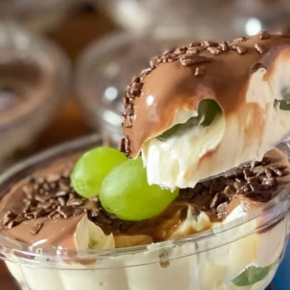 Delicioso copo da felicidade com camadas intercaladas de nosso soboroso brownie, brigadeiro de ninho, brigadeiro tradicional e uvas frecas.