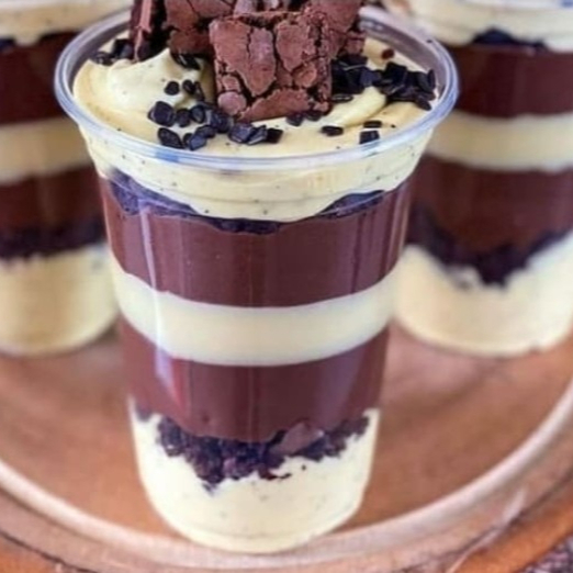 Delicioso copo da felicidade com camadas intercaladas de nosso soboroso brownie, brigadeiro de ninho e a cremosidade e sabor da nutella. Vale muito experimentar.