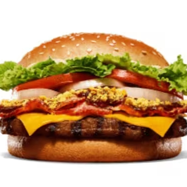 Um hambúrguer com duas carnes bovinas grelhadas de 113g, pão com gergelim, queijo derretido, fatias de bacon crocante e o exclusivo molho bk stacker.