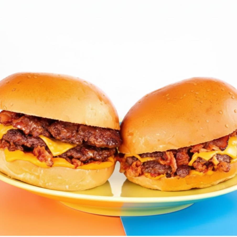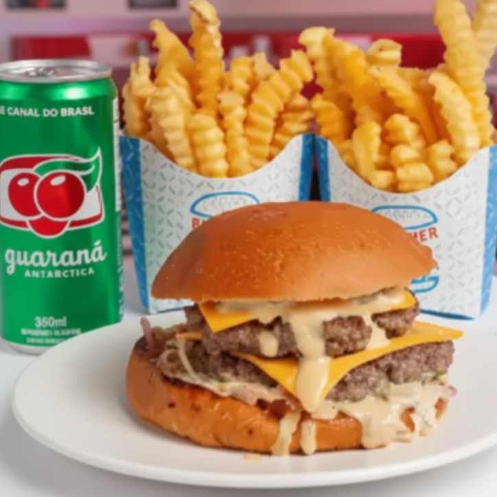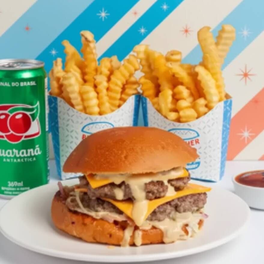 02 Burguers de 100g de Carne Bovina, 02 Fatias de Queijo Prato no Ponto, Cebola Roxa, Ketchup e Mostarda no Pão Brioche. Se um Klássico é Bom, Imagina Com Karne em Dose Dupla!