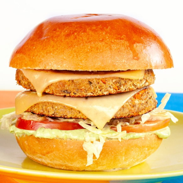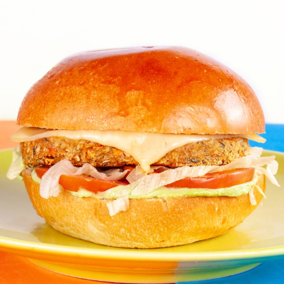 02 Burgers Vegetais de 100g (Grão-de-Bico ou Quinoa), 02 Fatias de Queijo Prato no Ponto, Alface Americana, Tomate e a Nossa Maionese Verde K-10 no Pão Brioche. Porkue Dá Pra Ser Veggie e Goxtoso pra K-10!