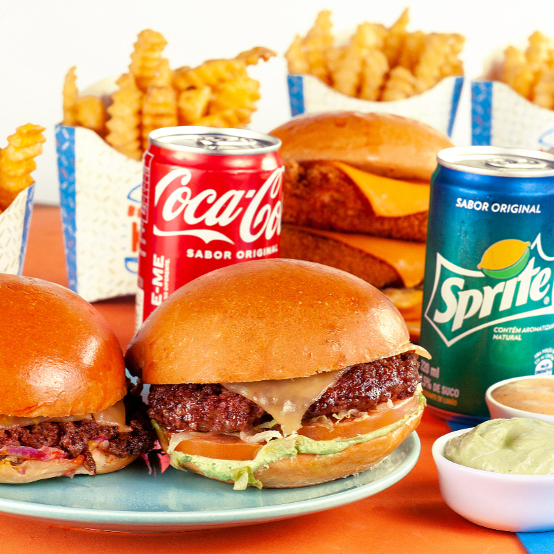04 K-burguers (02 K-classica + 02 Dupla) + 04 K-fritas + 02 K-molho + 02 K-drink