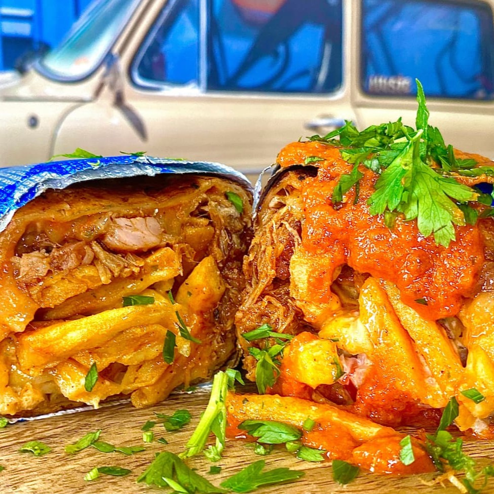 Pernil desfiado suculento ao barbecue defumado, pico de gallo, batata frita, fatias de cheddar derretido, molho texmex (a base de pimentas doces), picles de pimenta jalapeño e rucula, enrolado em uma tortilla de trigo legitima.