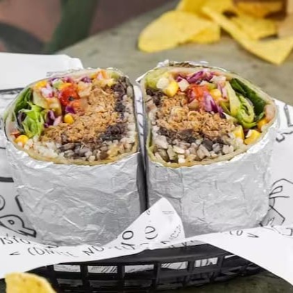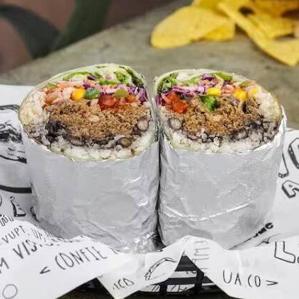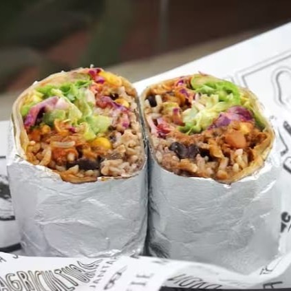 Burrito de Contrafilé em tiras e frango marinado grelhado com pimentões e cebola, arroz branco, feijão carioca bem temperado ao estilo mex, pico de gallo, Salsa Ranch de repolho, mix de folhas, molho texmex maionese de jalapeño Original santomex e mussarela, enrolado em uma tortilla trigo legitima.