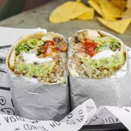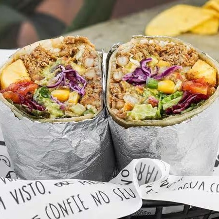 Burrito de Frango em cubos marinado com arroz branco, feijão carioca, fatias de cheddar, guacamole, Maionese de Jalapeño Original Santomex, pico de gallo, e alface, enrolado em uma tortilha de trigo legitima.
