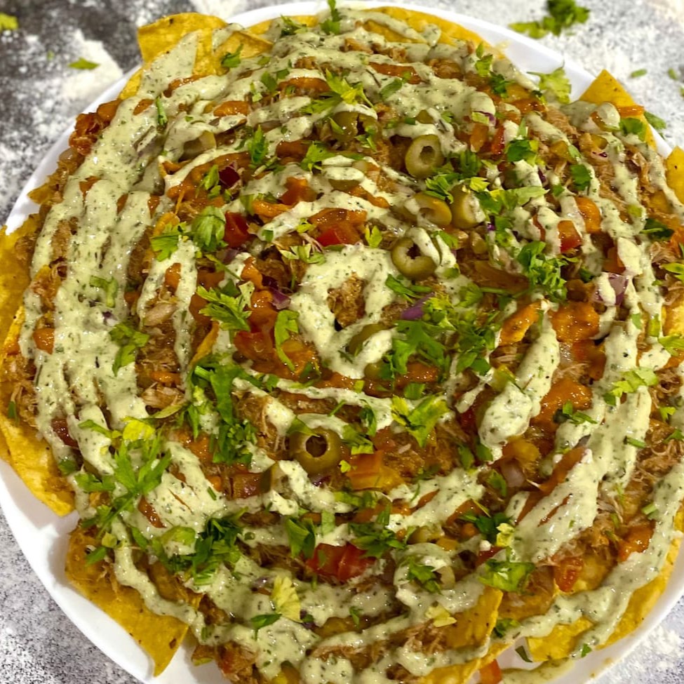 Nachos crocantes, mussarela, pernil desfiado suculento e chapeada com barbecue, pico de gallo, salsa, azeitonas, molho tex-mex e maionese de jalapeño Original Santomex.