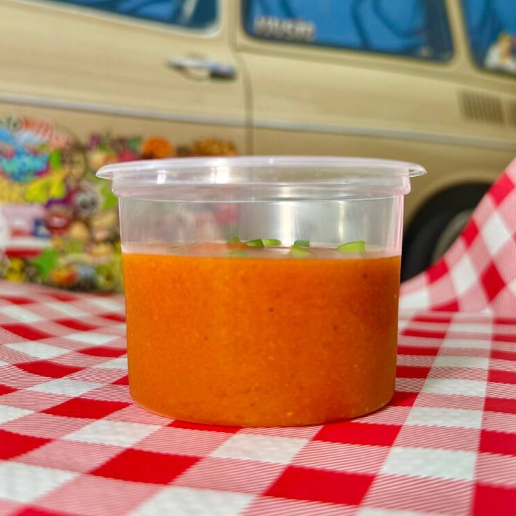 Feito a base de tomates frescos e um mix de pimentas tostadas, salsa, azeite e temperos.