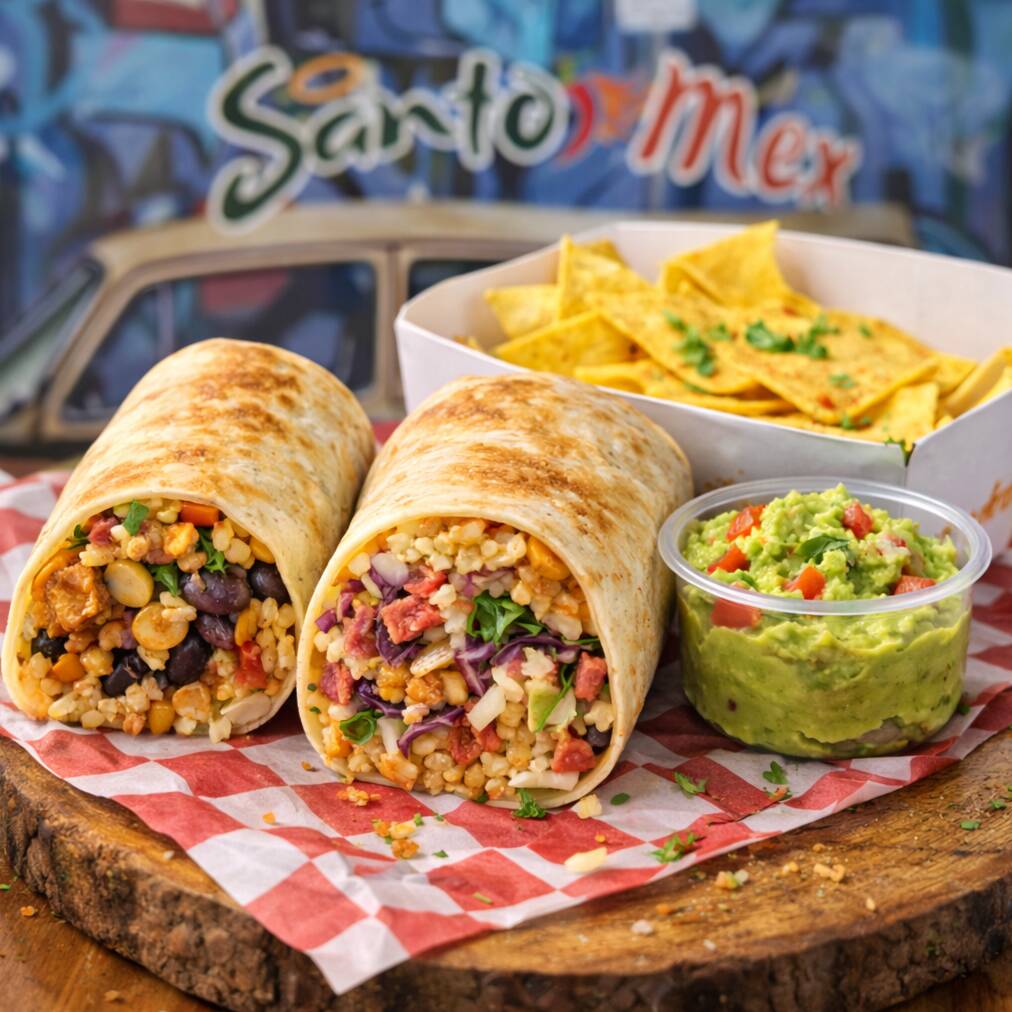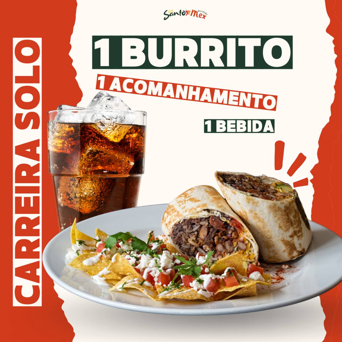 Burrito de Santo chilli (carne moída com feijão vermelho e molho especial de pimentas doces) com pernil desfiado suculento, arroz branco, sour cream, molho tex-mex, pico de gallo, mussarela ralada e mix de folhas, enrolado em uma tortilha de trigo legitima.