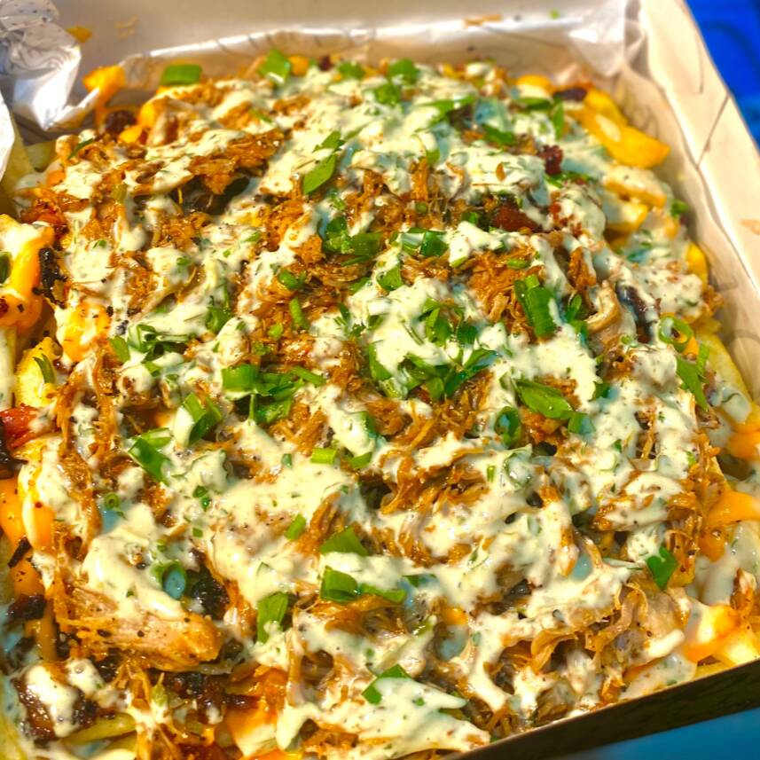 Batatas sequinhas e crocantes já temperadas e recheadas com: Pernil desfiado defumado ao barbecue, fattias de cheddar derretido, molho Tex-Mex, Maionese de Jalapeño e picles de jalapeño.
