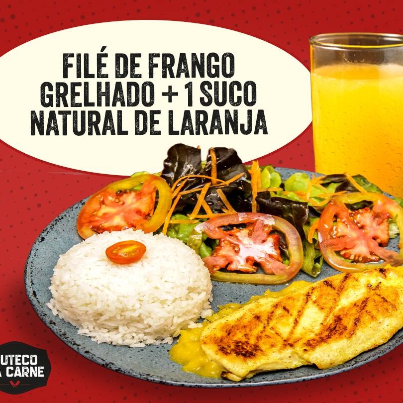 Almoço leve e saboroso te esperando! Filé de Frango Grelhado no ponto certo + Suco Natural de Laranja 300ml para refrescar seu Dia. Combinação perfeita pra quem busca equilíbrio sem abrir mão do sabor! Peça agora!