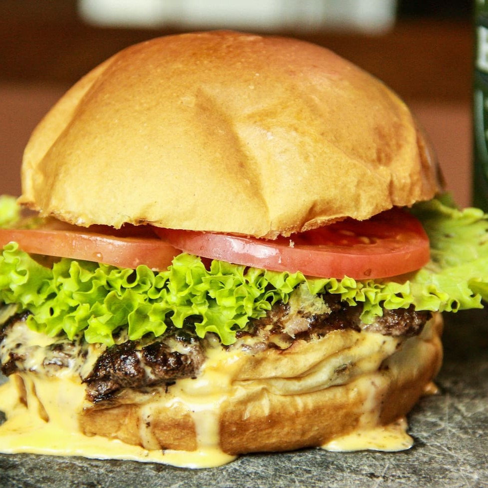 Pão, 100gr de carne, queijo, alface e tomate.