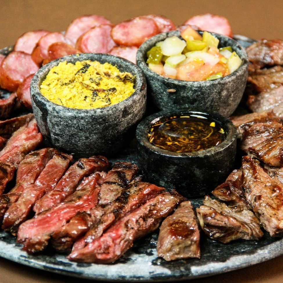 500gr de carnes (bovina e linguiça), acompanha chimichurri, vinagrete, farofa e pão de alho.