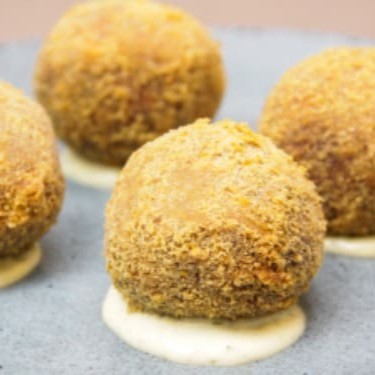 Porção de 10 unidades de bolinho de carne frito, acompanha maionese verde.