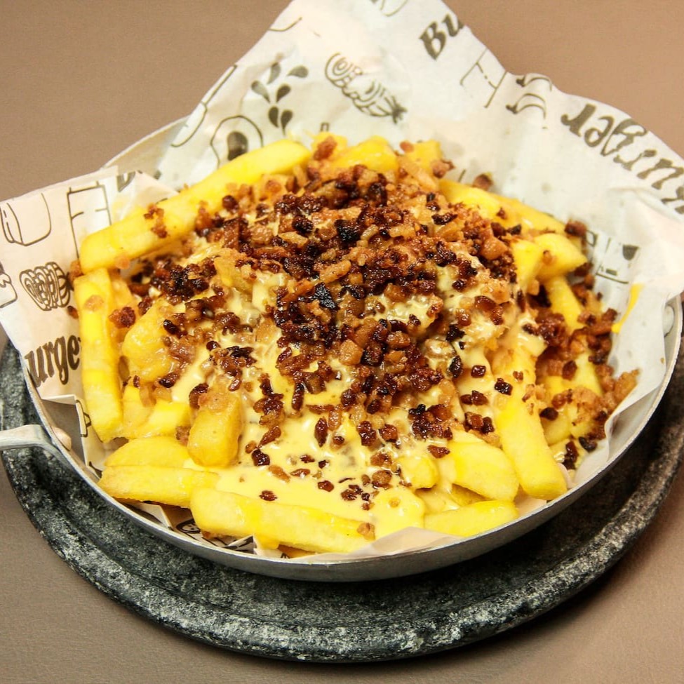 Batata crocante coberta com cheddar cremoso e bacon crocante.