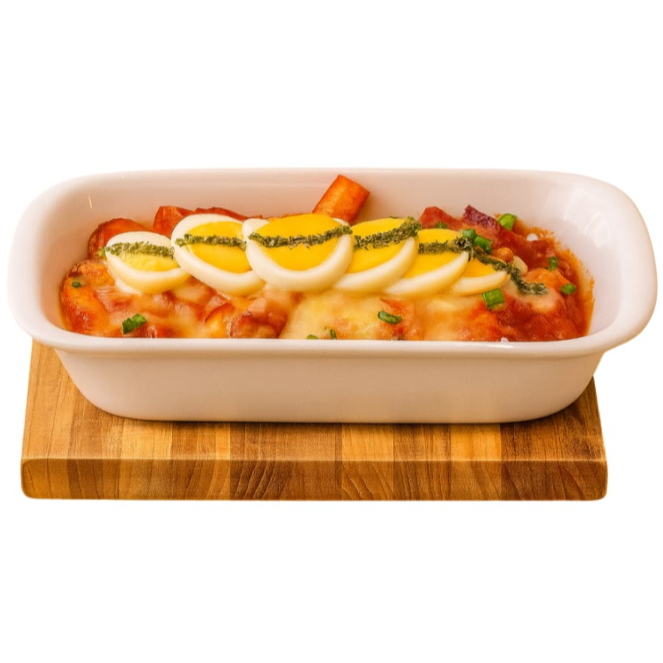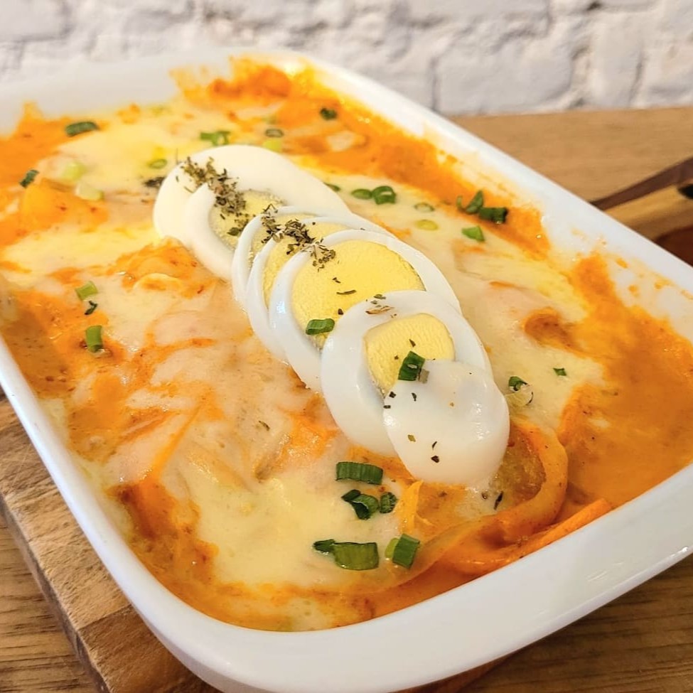 Bacon, Bastões de massa de arroz, pasta de peixe, molho levemente picante com creme de leite cremoso, nova tendência do Buzá