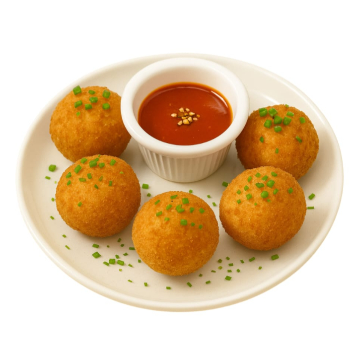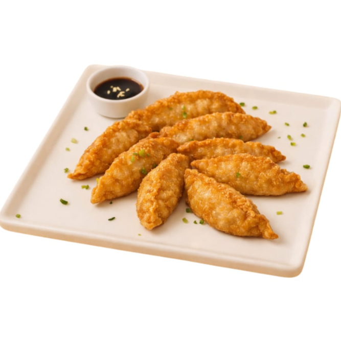 O PETISCO PERFEITO PARA BEBIDAS ALCOÓLICAS Bolinhos crocantes feitos com ingredientes coreanos, carne suína e especiarias (Porção • 6 un.)