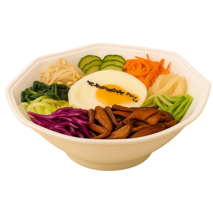 BIBIM SIGNIFICA "MISTURAR" BEM; BAP SIGNIFICA ARROZ Prato tradicional coreano com 8 vegetais, arroz, ovo e óleo de gergelim.