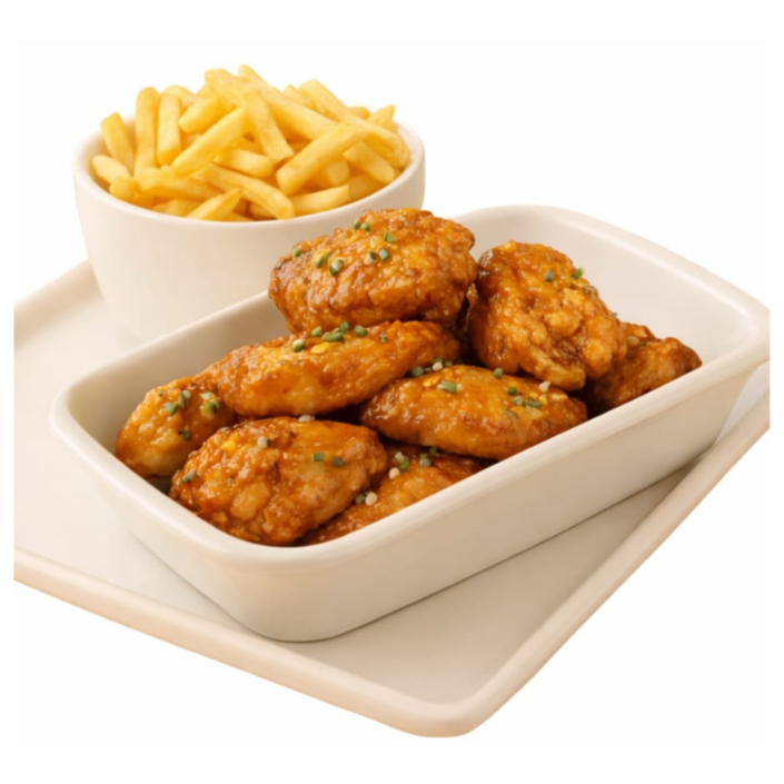 Asas de Frango crocante com batata frita. O preferido do Happy Hour coreano.