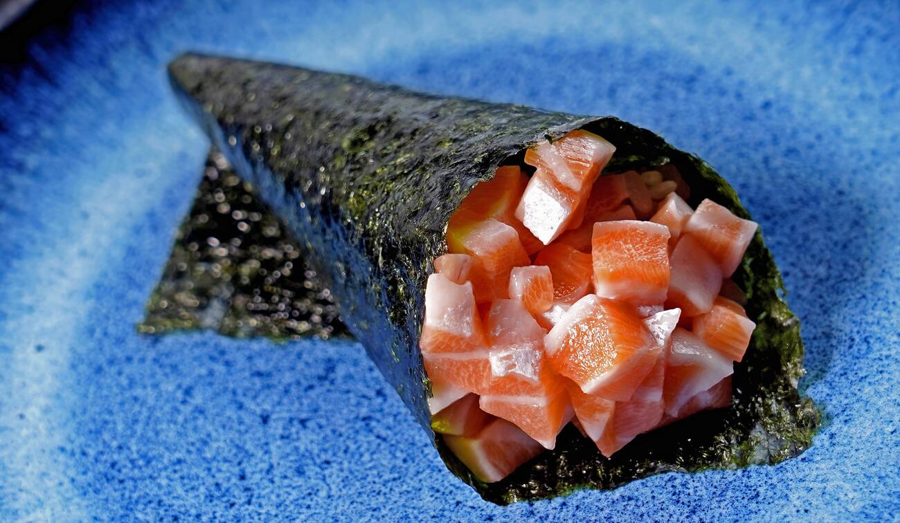 Salmão batido e temperado com uma camada de ovas de massago, acompanha nori e molho Ponzo