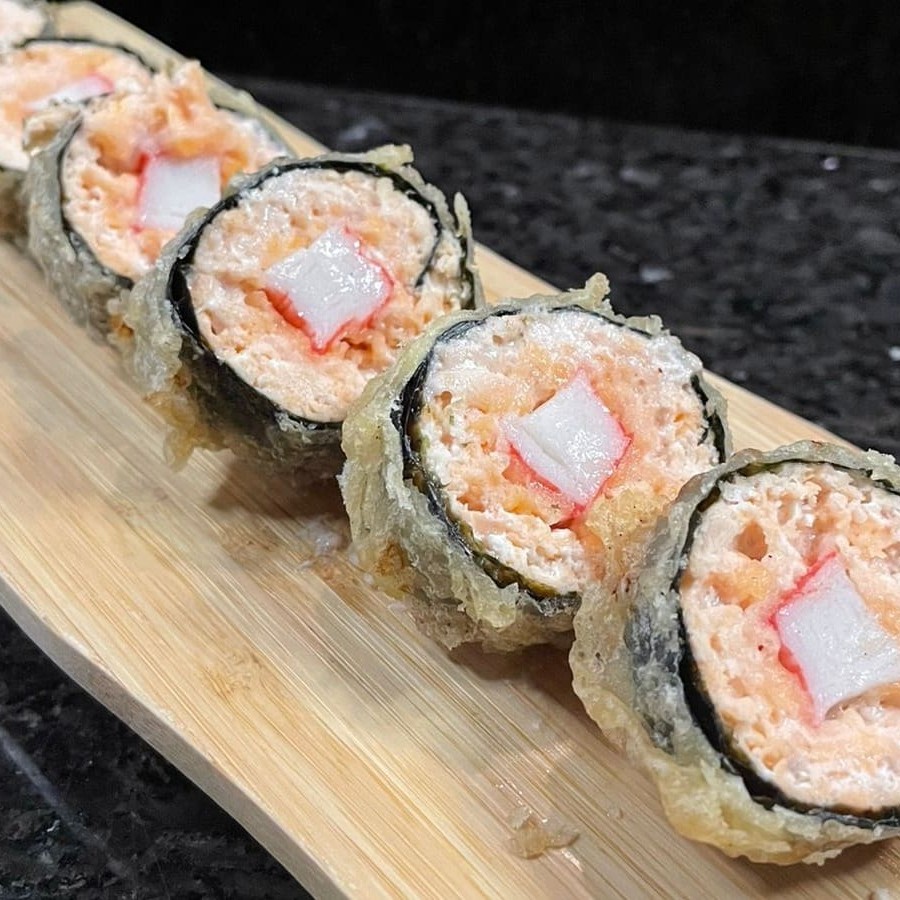 Roll de salmão batido, kani kama e cream chesse empanado e frito (6 unidades)