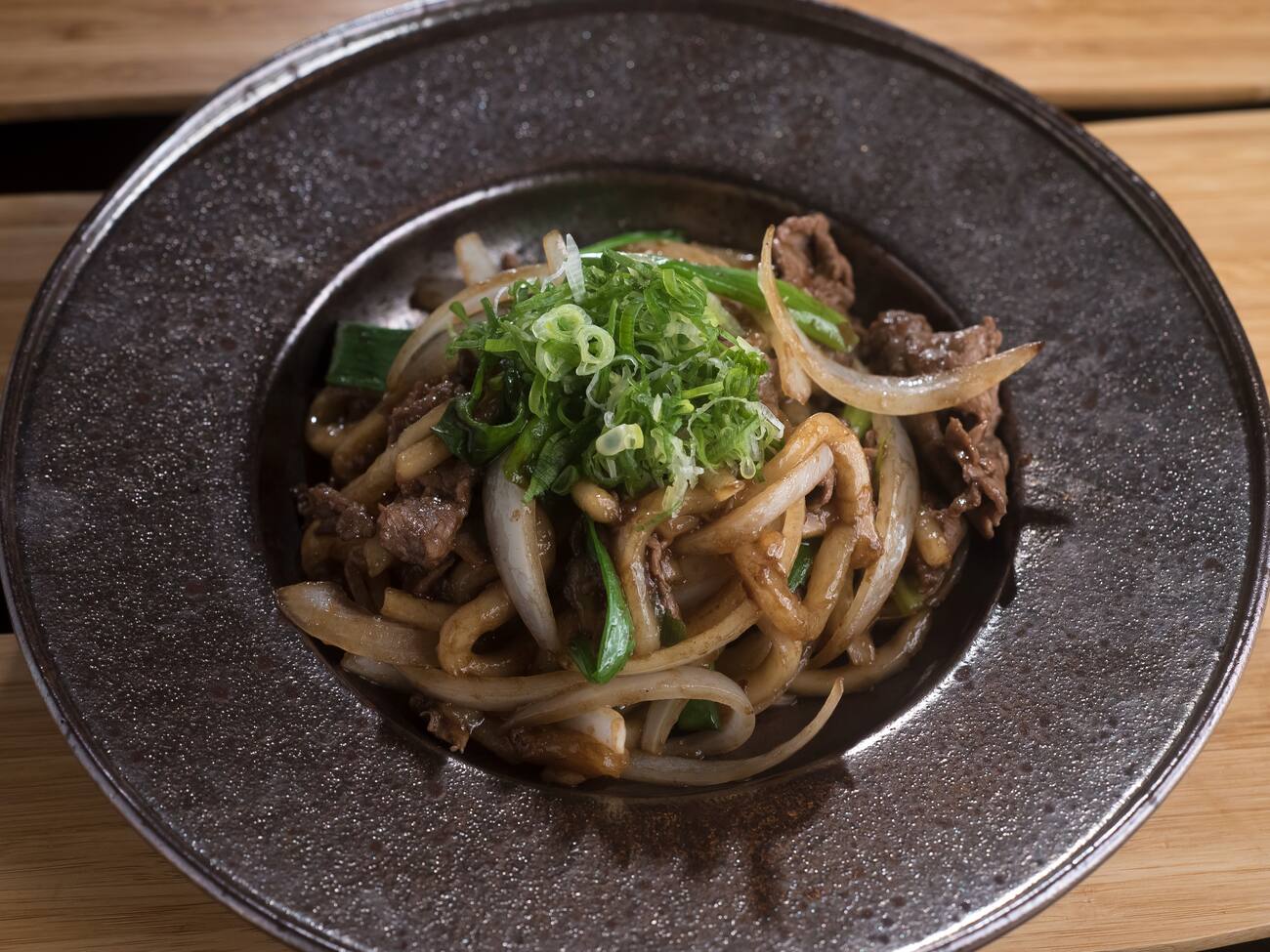 Macarrão de udon refogado com carne e cebola
