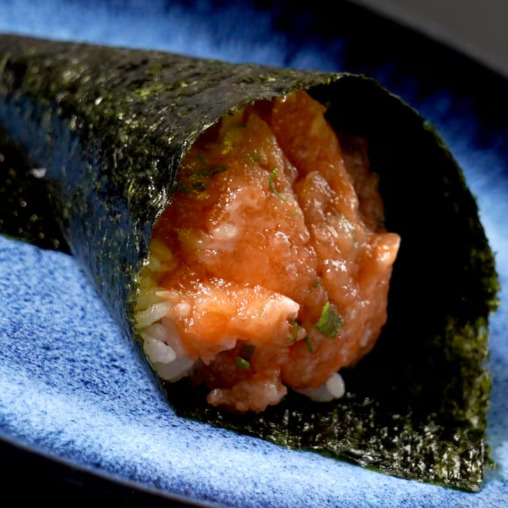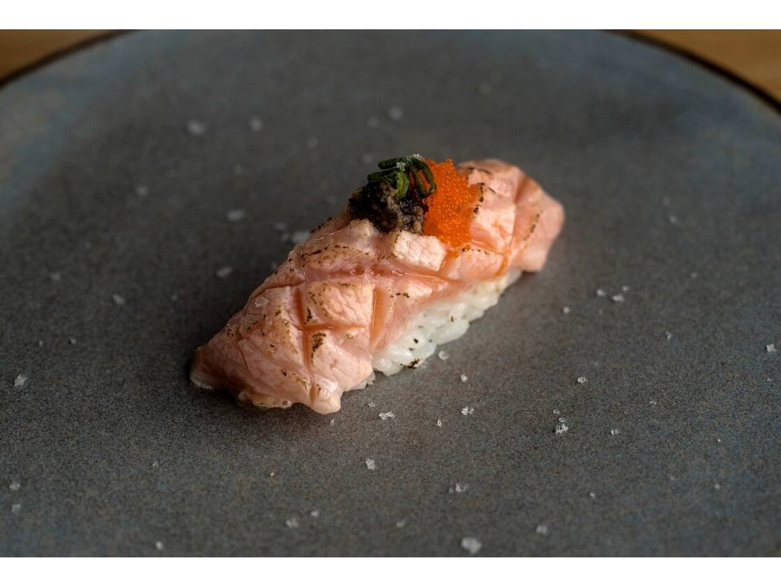 Salmão batido e temperado com uma camada de ovas de massago, acompanha nori e molho Ponzo