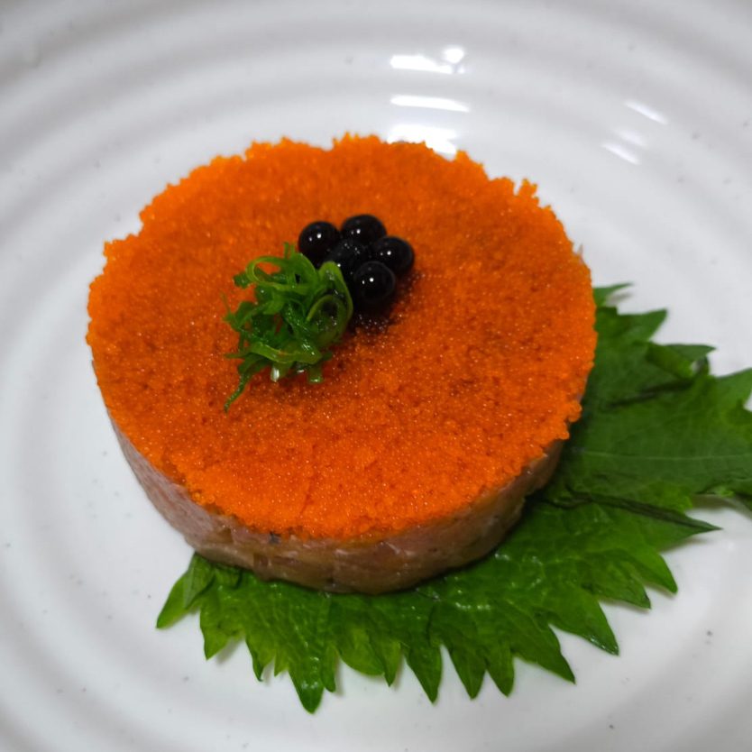 Atum apimentado batido e temperado com uma camada de ovas de massago, acompanha nori e molho Ponzo