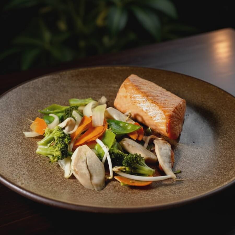 2 filés de salmão grelhado, acompanha gohan e legumes saltiados na manteiga