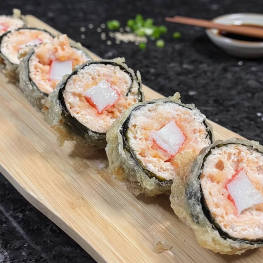 Roll de salmão batido, kani kama e cream chesse empanado e frito (6 unidades)