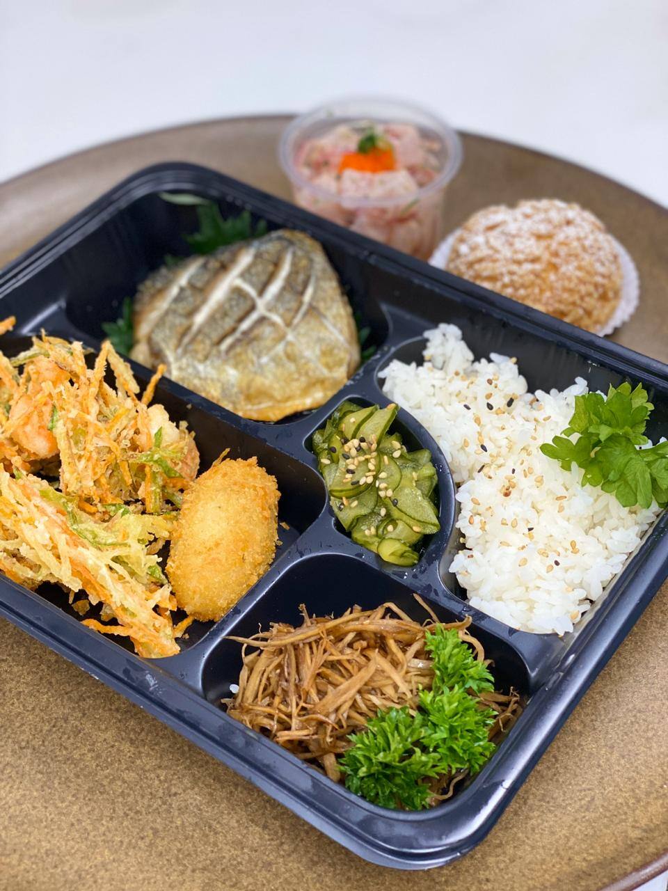 Acompanha Gohan, mini Kakiague, kani koroke, shimeji, porção de ceviche, porção de sunomono e sobremesa do dia