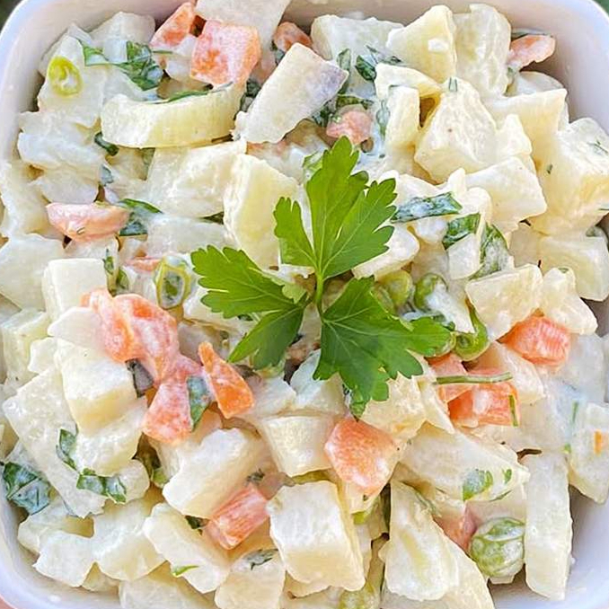 A clássica salada de maionese feita com, batata cenoura, maionese, milho e ervilha