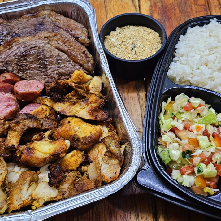 300g de Picanha assada na Brasa, 2 coxa com sobrecoxa desossada e cortada, 2 gomo de linguiça toscana assada na brasa