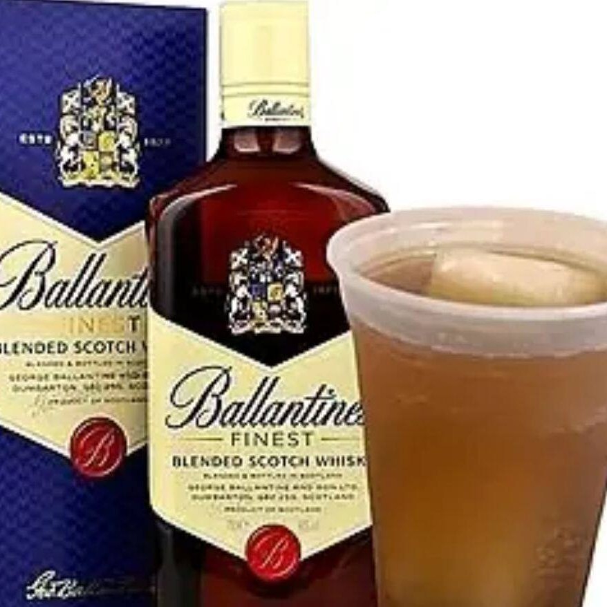 Whisky Ballantine’s, Bally e gelo saborizado, acompanhado de copo e canudo.