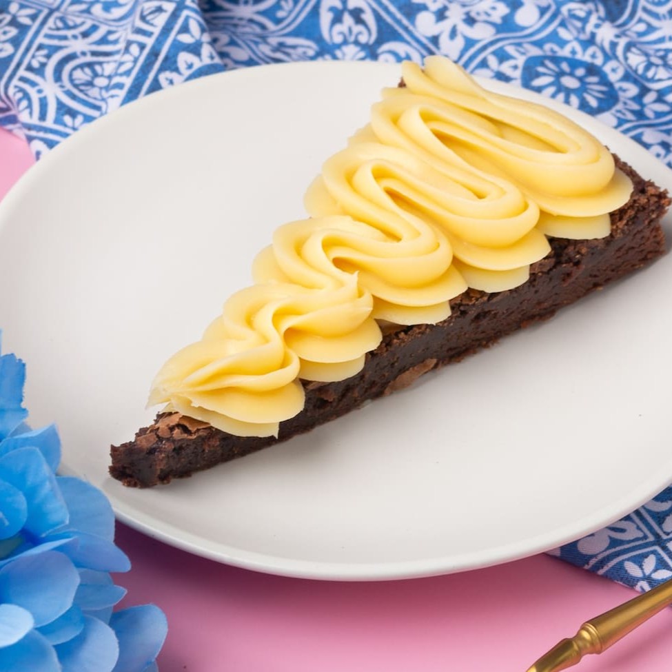 Deliciosa fatia do nosso brownie com uma camada de brigadeiro gourmet.