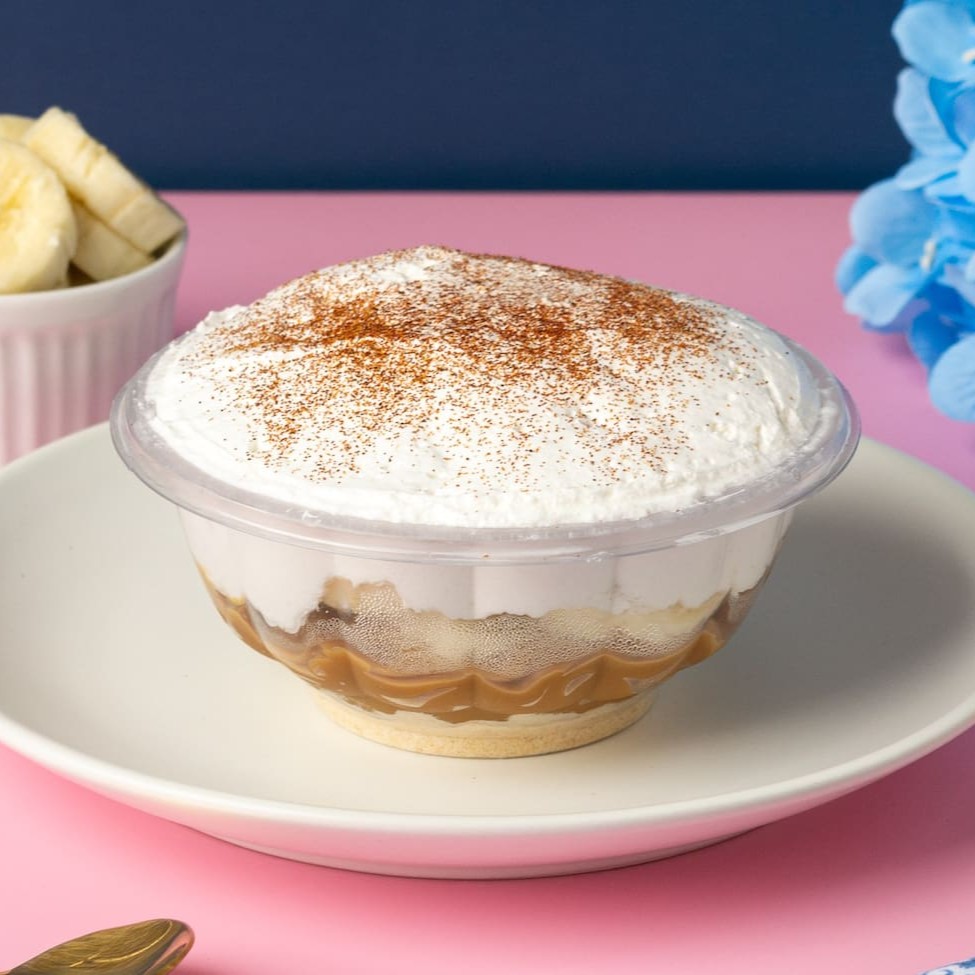 Farofa de biscoito, banana selecionada, doce de leite artesanal da nossa cozinha, chantilly e canela. Nossas sobremesas são preparadas na hora, bem fresquinhas especialmente para você. Recomendamos o consumo imediato.
