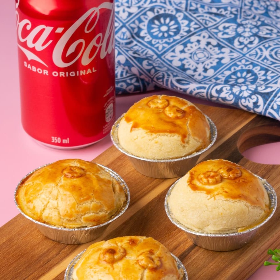 Aproveite agora 4 empadas com recheios deliciosos e uma bebida geladinha. Escolha as empadas e a bebida nas opções. (imagem ilustrativa como sugestão de bebida 1 Coca-Cola Original 350ml)