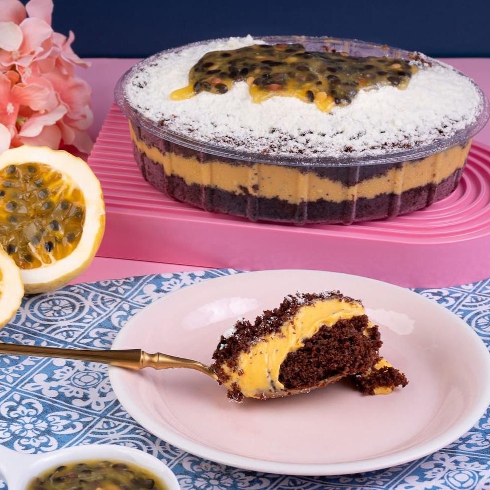 Massa de chocolate com brigadeiro de maracujá, finalizado com leite em pó Ninho. Importante: As sementes foram removidas da finalização. Será enviado apenas com leite em pó Ninho na cobertura. Pesos aproximados: Travessa Pequena, a partir de 600g (aproximadamente 4 porções de 150g) Travessa Grande, a partir de 1,3 kg (aproximadamente 8 porções de 150g)
